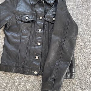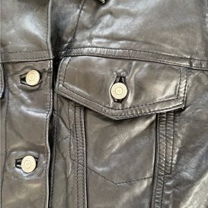 Vintage Leather Trucker Jacket finished in black showing in excellent used condition for its age, with no signs of excessive damage. Please study photos and reach out if you have questions.