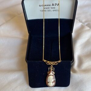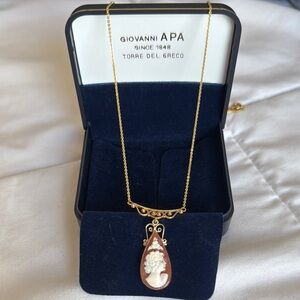 This exquisite ANTIQUE Torre Del Greco GIOVANNI APA necklace features a stunning oval-shaped cameo pendant set in a decorative 14kt gold frame. The pendant is elegantly suspended from a fine gold chain, making it a perfect accessory for any occasion. Its intricate design and luxurious gold color add a touch of sophistication to your jewelry/antiques collection! *Original gold chain is in exceptional condition. The chain is attached to this antique cameo pendant, necklace combo. RARE ESTATE PIECE.