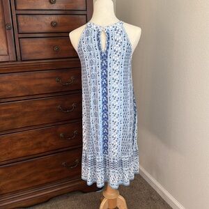 Like new blue and white Loft halter dress. Perfect for that upcoming vacation to sunnier climates. See photos for mo details. Beautiful shades of blue and white. Stretchy rayon and spandex lightweight knit.