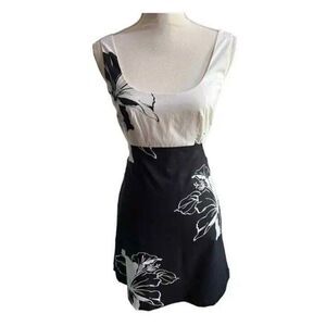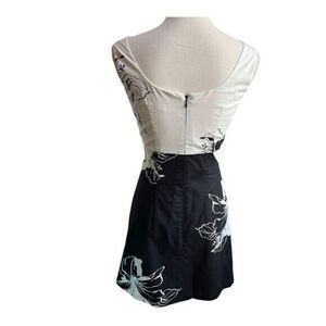 This stunning Oonagh by Nanette Lepore dress features a black and white floral pattern with a scoop neckline and sleeveless design. The dress has a zip closure and is made of a combination of spandex and cotton material, ensuring both comfort and style. Its short length and cut-out feature make it perfect for a variety of occasions, including weddings, parties, and cocktail events. The dress comes in size 2 and should be dry cleaned only.