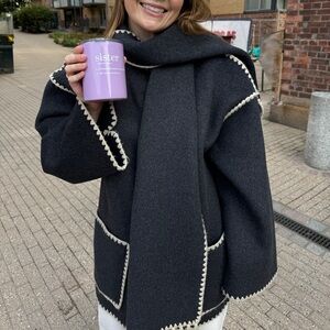 Toteme scarf jacket bought in Norway from a platform like Posh! The material is super thick and warm. I can wear it in fall open with light under layer, or deep winter closed with heavier layers under. Scarf is attached / cannot be removed.