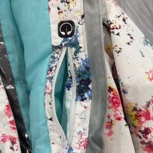 Women’s Ski Jacket with removable hood size Medium has been worn once. This jacket has a waist cinch ability that keeps the snow from going up the jacket. There are multiple interior pockets, one on the left side to put your phone with access for headphones through the jacket. On the left sleeve there’s a place for ID easy access. Jacket is white with multiple flex of colors.
