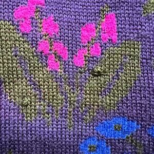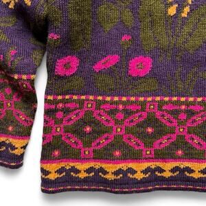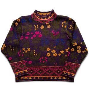 Vintage 80s Floral Pattern Mock Neck Purple Yellow Green Knit Sweater Geometric