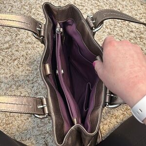 Fits over the shoulder or carry by hand. Two bigger pockets on the inside with one zipper pocket in the middle. Metallic bronze/silver color. In great shape!