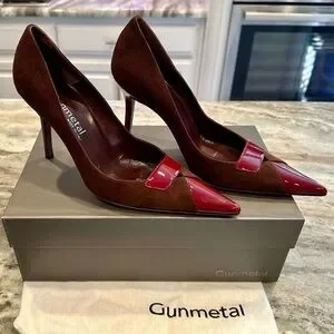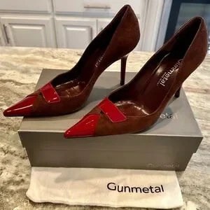 Rare Vintage Gunmetal Brown Suede with Red Patent Leather Pumps - Size 8 - EUC