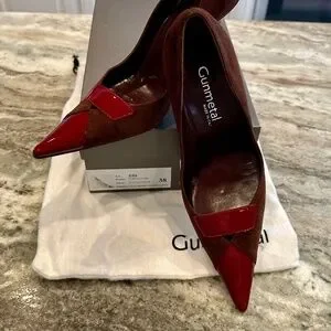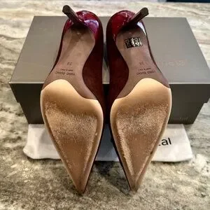 Step into timeless elegance with these stunning vintage pumps! Crafted from luxurious brown suede and accented with striking red patent leather trim at the pointed toe and heel, these Italian-made beauties exude sophistication. Perfect for any fashion-forward wardrobe.