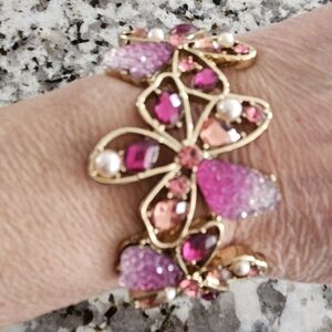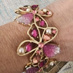 Beautiful Anne Klein shades of pink on gold tone setting. Easy click clasp bracelet with clip on earrings. Worn once!