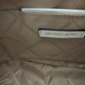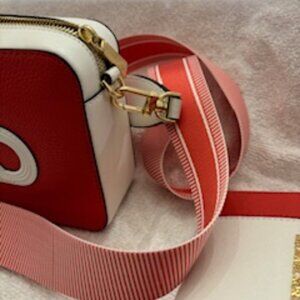 Michael Kors rich coral and white leather logo handbag in Spiced Coral. Strap attached with goldtone toggle and buckle measures appx 51" and the strap is coral and striped white fabric with white leather accents at each end. Bag measures appx 8-1/4" wide, 2-1/2" deep and 5-3/4" high. Goldtone zip closure with MK zipper pull. Interior is MK logo in taupe fabric with a side pocket. INCLUDED: Matching small wallet measures appx 5" across, 1" deep and 3" high. No dust cover NWT