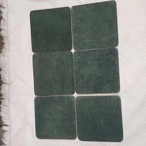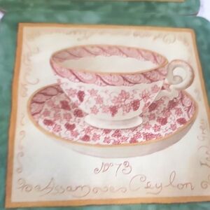 Elegant tea coaster set by Willscombe. Features a classic teacup design. Perfect for tea lovers, green velvet backing. Set of six. I only used Two of them. Excellent condition.