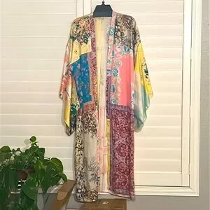 👘EUC Free People Patched With Love Robe/Kimono. This silky feeling kimono features a a multicolor floral patterns, wide authentic square kimono sleeves, and open design. Versatile- use as a robe or kimono over anything- jeans, maxi dress, leggings!