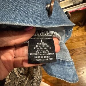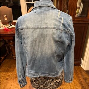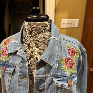 Purchased and have never worn. No tags. She is a beautiful cropped jean jacket that is distressed and adorned with embroidered floral flowers.