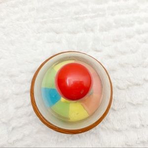 Spinning top toy. Turn the red handle at the top and big bird on a colorful wheel spins with different colored balls