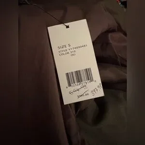 New Vince leather jacket in olive. Color is brown to olive. Front angled zip closure. Two side pockets. Adjustable neckline, can snap closed for more coverage. Side panels on bodice & sleeves for comfortable slim fit. Cotton interior lining. Armpit to armpit 17”. Neck to bottom 25”. New with $995.00 tag.