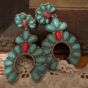 These babies are beautiful. They feature a detailed silver earring with faux turquoise and coral. The are great quality, have some weight to them. About three inches long or so.