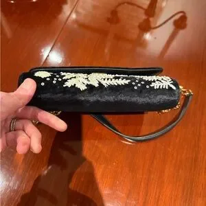 Stunning brand new bag beaded and sequined. The pictures do not do the shimmer and shine of this Gorgeouss leather and velvet bag justice. This is one f the prettiestt bags I’ve seen truly. Never used comes with dustbag. Measures 8 inches long 6 inches wider and has a 22.5 gold chain strap.