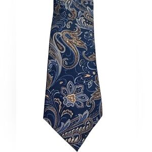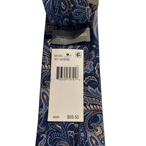 Elevate your formalwear with this stunning Michael Kors men's blue paisley tie, made from 100% silk. Featuring an intricate paisley design in shades of blue, gold, and beige, this tie adds a sophisticated touch to any suit or dress shirt. The luxurious silk fabric ensures a smooth and elegant finish, perfect for weddings, business meetings, or special occasions. This tie is brand new with tags and has an MSRP of $69.50, offering high-end quality at an affordable price.