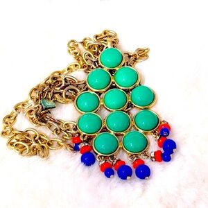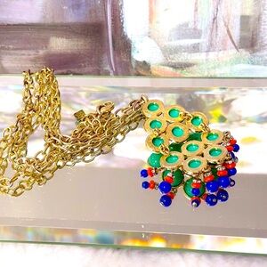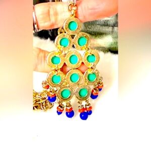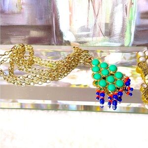 Long Gold tone Necklace With Turquoise, Coral, Blue Beaded Pendant