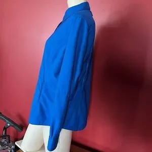 This shirt is in perfect condition! Absolutely love the deep blue color. This is snap button front. The sleeves can be rolled up and snapped up. There is a zippered pocket on the left side of shirt. This also has a vented back. Approximate measurements are 21 inches pit to pit and 25 1/2 inches from shoulder to bottom of top. As always smoke and pet free home. Same-day shipping! Willing to negotiate prices.