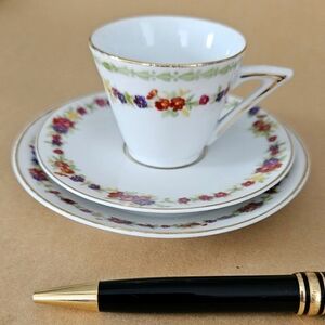 Antique Childs Miniture Doll Tea Party Cup, Saucer, & Bread Plate. Genuine porcelain from Pre War Germany. B&B plate is approximately 5" (pen just for scale and not included). Reminds me of Jaeger & Co "Trianon".