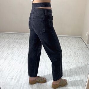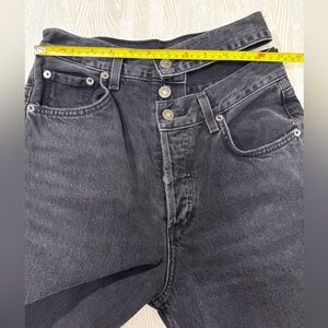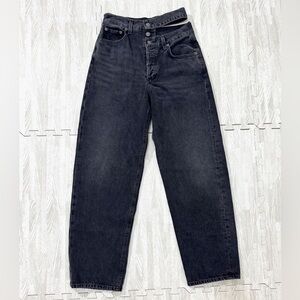Super cute, faded black wash, cutout waist, button fly, high rise, loose fit straight leg jeans from AGOLDE. Size 25. In excellent condition. Measurements and fabric description in photos