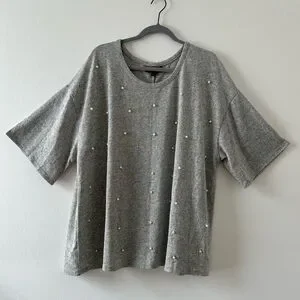 Measures about 27.5 inches pit-to-pit with additional stretch, and 31 inches shoulder to hem.