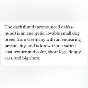 Famously nicknamed the "hot dog" or "wiener dog," Dachshunds (or Doxies, for short) are known for their long silhouette, short muscular legs, brave and energetic personality, &for always being on the lookout.