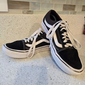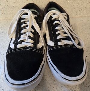 Classic Vans Old Skool black and white sneakers with iconic side stripe. Comfortable and stylish. Size: 4.5 youth or size 6 women