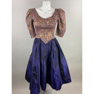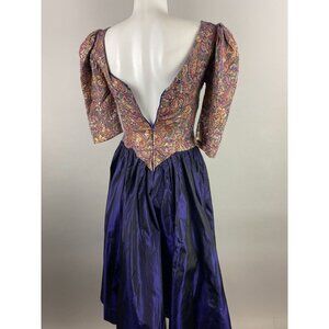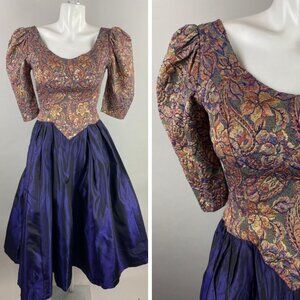 Vtg 80s Purple Gold Floral Tapestry Brocade Purple Taffeta Prom Tea Dress Glam S