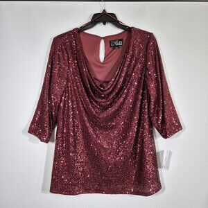 Alex Evenings Women's Size 3X Red Sequined Cowl Neck Blouse Tunic Top Plus 46