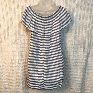 Adorable blue and white striped off-the-shoulder dress. Size small. Short sleeves and a ruffle neckline. Lightweight and perfect for summer.