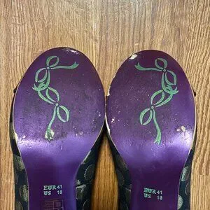 Gorgeous retro-inspired polka dot heels by Poetic Licence. Hold Up in black and gold large penny dot heels, featuring glittery gold bow to toe, heel and trim throughout, with purple accents. Heel has been reinforced, soles show some wear but design is still intact. They do not have tread.