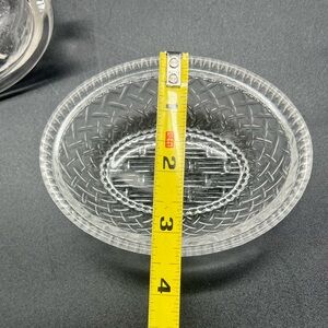 This vintage Imperial Glass by Lenox Bunny on Nest is a medium-size and made of clear glass. The bunny sits on a basket dish, measuring 4.5 inches in length, 4 inches in height, and 3.5 inches in width. The piece, originating from the late 20th century, features intricate details of a rabbit, making it a charming addition to any room or Easter-themed decor.