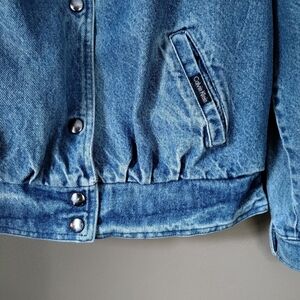 This is such a treasure! I am in love with this coat. This is a very well made quality jean jacket with lots of life left. Black and red checkered lining. Elastic at bottom back of coat with some give. Snap closure. Pleated at the shoulders. Snap adjustable cuffs. This is just the cutest coat ever. See the well worn love marks on the inside lining in photo. Can easily be patched up. Approximate measurements in photos. It's older and tiny tag indicates size L but it fits like M/L or PL