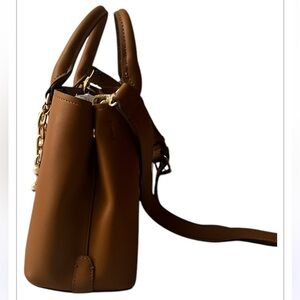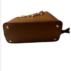 A glossy chain with charms adds elegant distinction to a structured tote bag outfitted with a divided interior compartment and optional crossbody strap for hands-free styling. Gorgeous Nutshell brown color pairs nicely with many colors and wearable in any season.