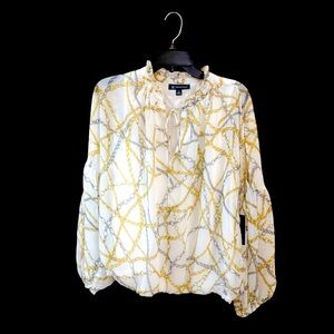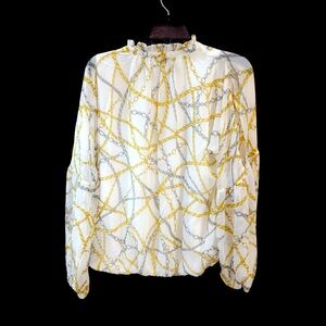 Beautifully made Cold Shoulder Blouse with silver and gold chain link pattern. Ruffle neckline.
