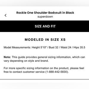 Women's size XS. Purchased directly from REVOLVE. New with tags (NWT). Thick black material that sucks you in in all the right places (fits almost like shape wear but not as uncomfortable). Has a snap closure at the bottom and a side zipper that is the full length of the body suit. One shoulder asymmetrical top style. The XS fit perfectly (I'm 5'0" for reference)!