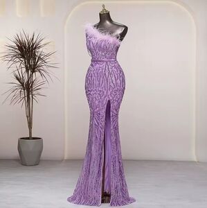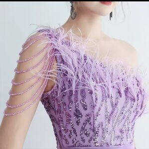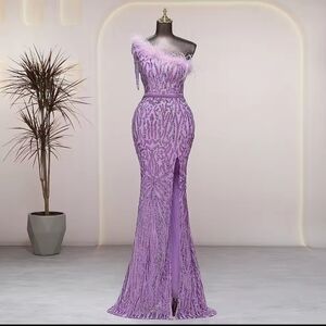 Purple, Geo Print, Assymmetrical Neck, Ostrich Feather, Beaded, Sequined Gown