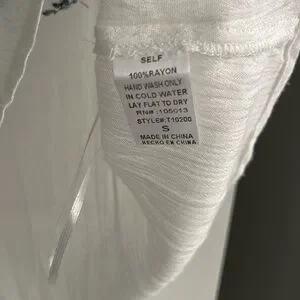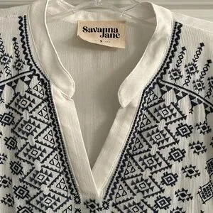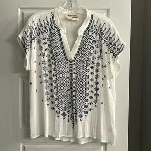 Navy embroidery decorates the front of this short sleeve V neck white top. Rayon sheer fabric. Flowy.