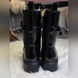 Womens Biker Combat Boots. Size 38 or womens size 7. Comes with box. Has side Zipper and laces. Shoes are very light weight material. Not sure what the material of the shoes are exactly. If you have big calf I wouldn't recommend