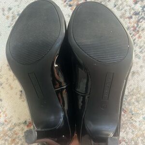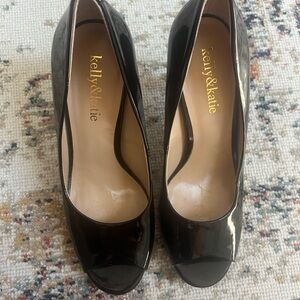 Pre-owned. Good condition. Elegant black patent leather heels. Peep-toe design. Perfect for formal occasions.