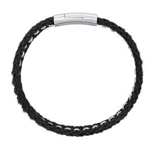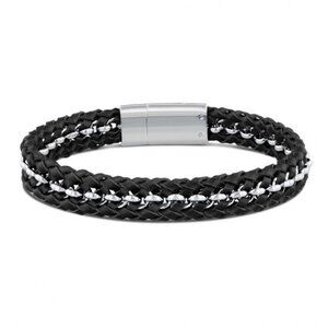 Featuring a stainless steel clasp, this black leather bracelet is crafted with a stainless steel chain woven into the braided design.