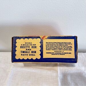 The Vintage Nordic Ware Double Rosette and Timbale Iron 5-Piece Set includes a handle with 2 prongs for dipping, 2 rosette molds and 2 Timbale patty shell molds. The vintage set is branded by Nordic Ware and comes with a manual/recipe booklet. Please see pictures.