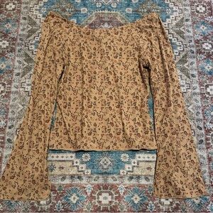 Y2K Tan floral print off the shoulder long sleeve top with bell sleeves size Large