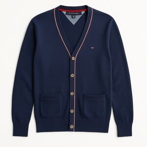 Elevate your preppy wardrobe with this classic Tommy Hilfiger Navy Button-Up Cardigan in Men’s Size Large.