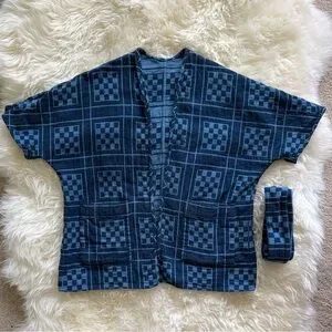 Ace & Jig Capella Jacket in Atlantis reversible to Sail. Reversible open-front jacket with elbow length dolman sleeve, integrated patch pockets and optional sash belt. Indigo substantial doublecloth with woven faded denim blue checkboard reversible to faded denim blue with woven indigo.
