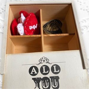 This is the perfect addition to your home! This 4-compartment wood box has the words “All You Need Is Love” printed on top. The lid slides open to reveal 4 compartments, two already filled with small heart-shaped pillows (some with sayings on them) and 6 graduating heart-shaped cookie cutters.