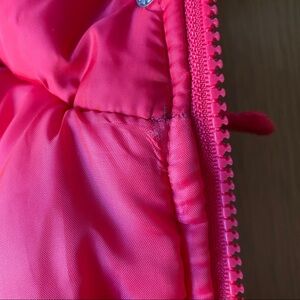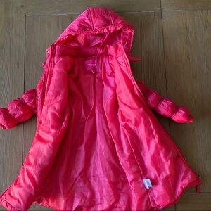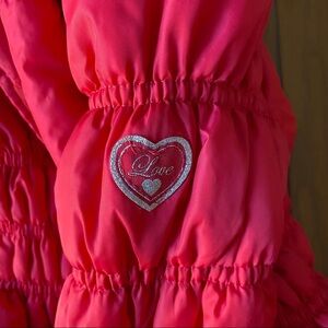 Girls pink long hooded puffy coat from Sportoli Outerwear. Really cute and warm, it zips up and has a Velcro and snap cover. The hood also has Velcro traps to bundle up from the cold. Little love heart patch on the sleeve. Great preloved condition, one tiny flaw I almost missed it see pics.