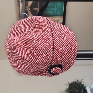 Red and white striped wool feel hat. Sassy short bill.