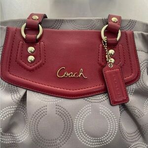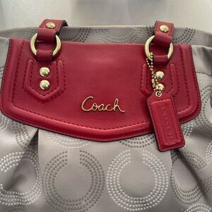 This Coach handbag features a stylish combination of red and beige colors. It is in great condition with no flaws, very clean, and has been barely used. The exterior is red with a beige handle/strap, complemented by a beige lining. The hardware is in a matching red color, adding a pop of contrast. Perfect for adding a chic touch to any outfit.