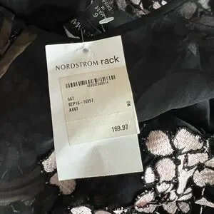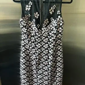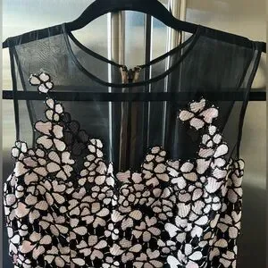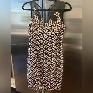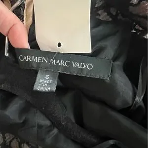 Beautiful new with tags never worn womens dress by Carmen Marc Valvo. Black with pink embroidered flowers. Zipper and hook and eye closure on back. Has slight slit in back as shown. Knee length.
